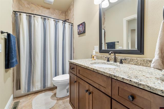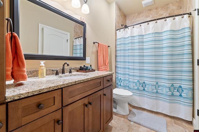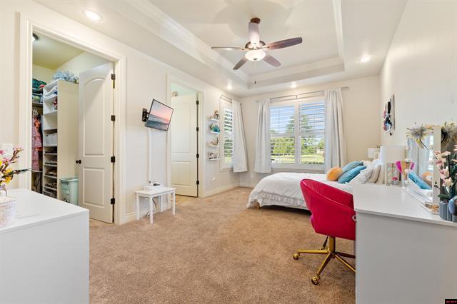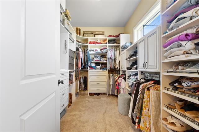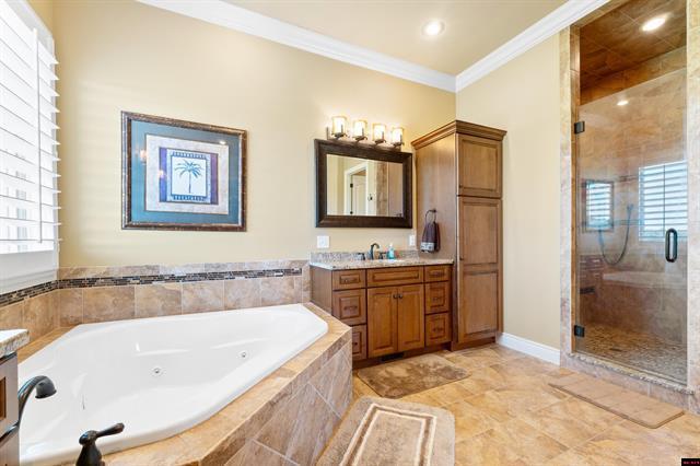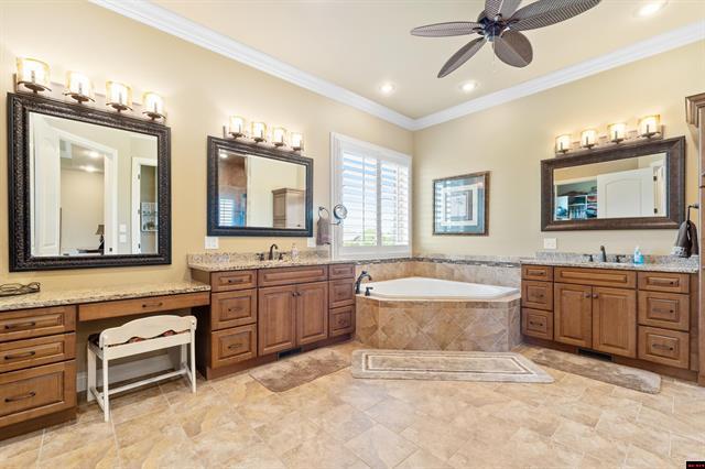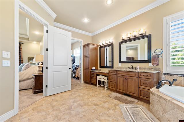 The spa-like primary bath boasts dual vanities, a soaking tub, and a walk-in shower.