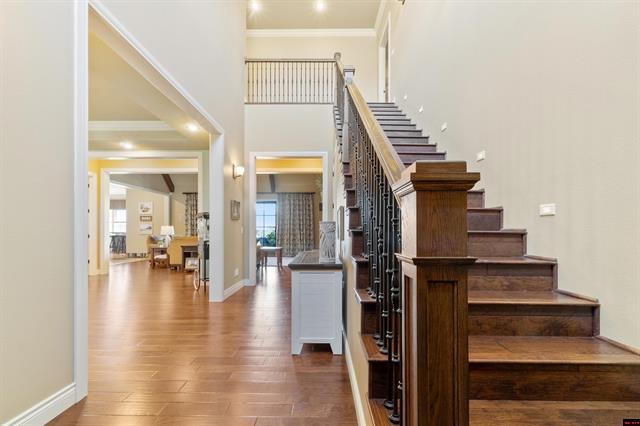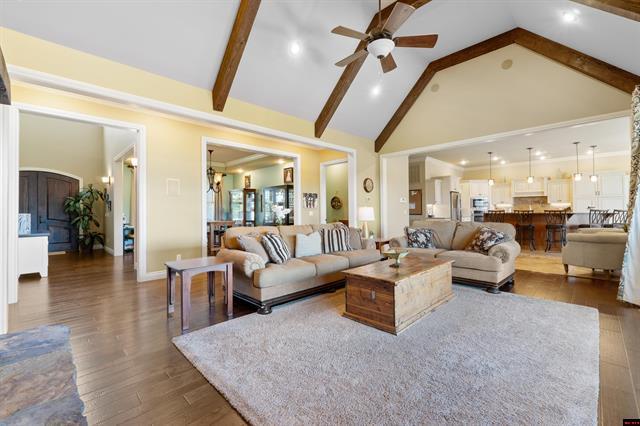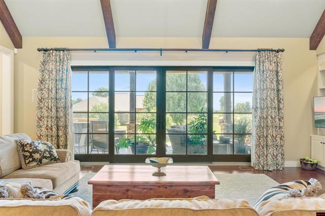 From the moment you enter, you're greeted by a stunning living room with soaring vaulted ceilings, exposed wooden beams, floor-to-ceiling glass windows, and custom built-in shelving—all bathed in natural light for a dramatic yet inviting atmosphere.