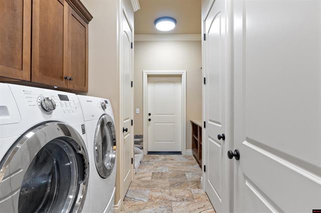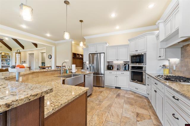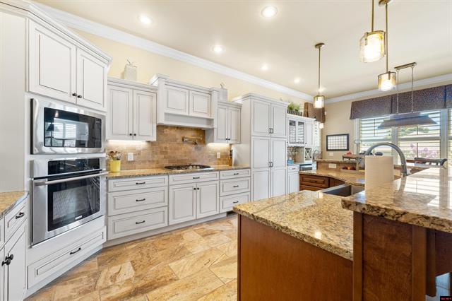 The gourmet kitchen is a chef’s dream, offering extensive cabinetry, generous counter space, and refined finishes.