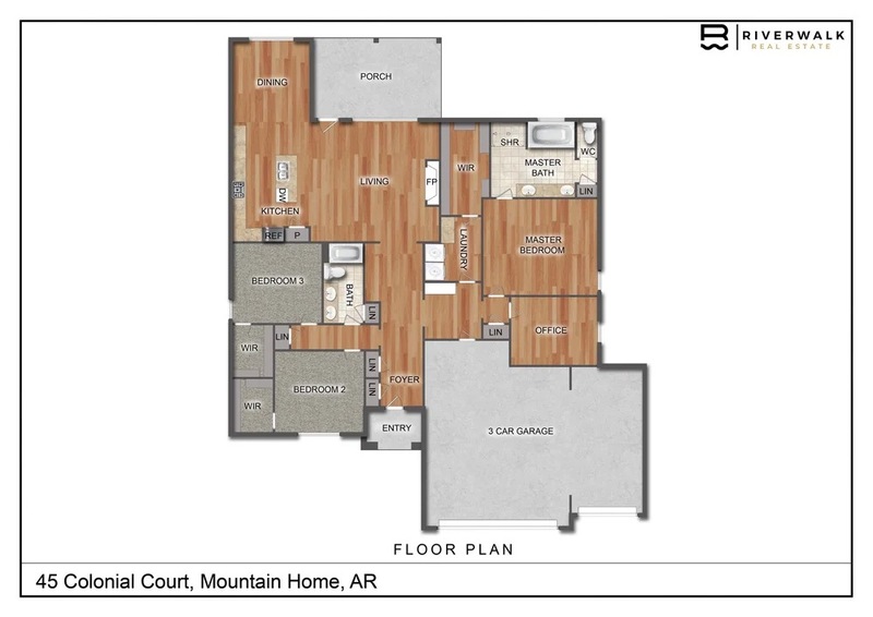 This beautiful new construction home is 2,457 sqft heated and cooled with 3,559 sqft under roof, 3 bedroom 2 bathrooms 3-car garage with office in Big Creek Estates neighborhood in Mountain Home, Arkansas.